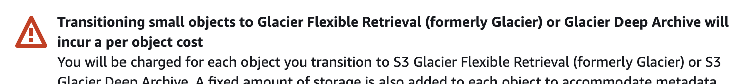 But isn't there like a million billion objects?? How about a different storage class?  Requests & data retrievals > Lifecycle Transition requests into (per 1,000 requests). Even though the s3 console does not produce the ominous warning when selecting other storage classes, transitional request charges apply. Fuuuuuuuuu